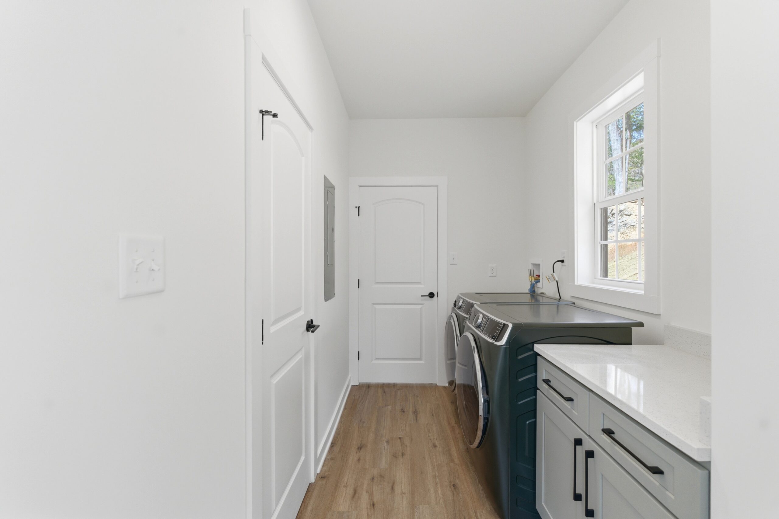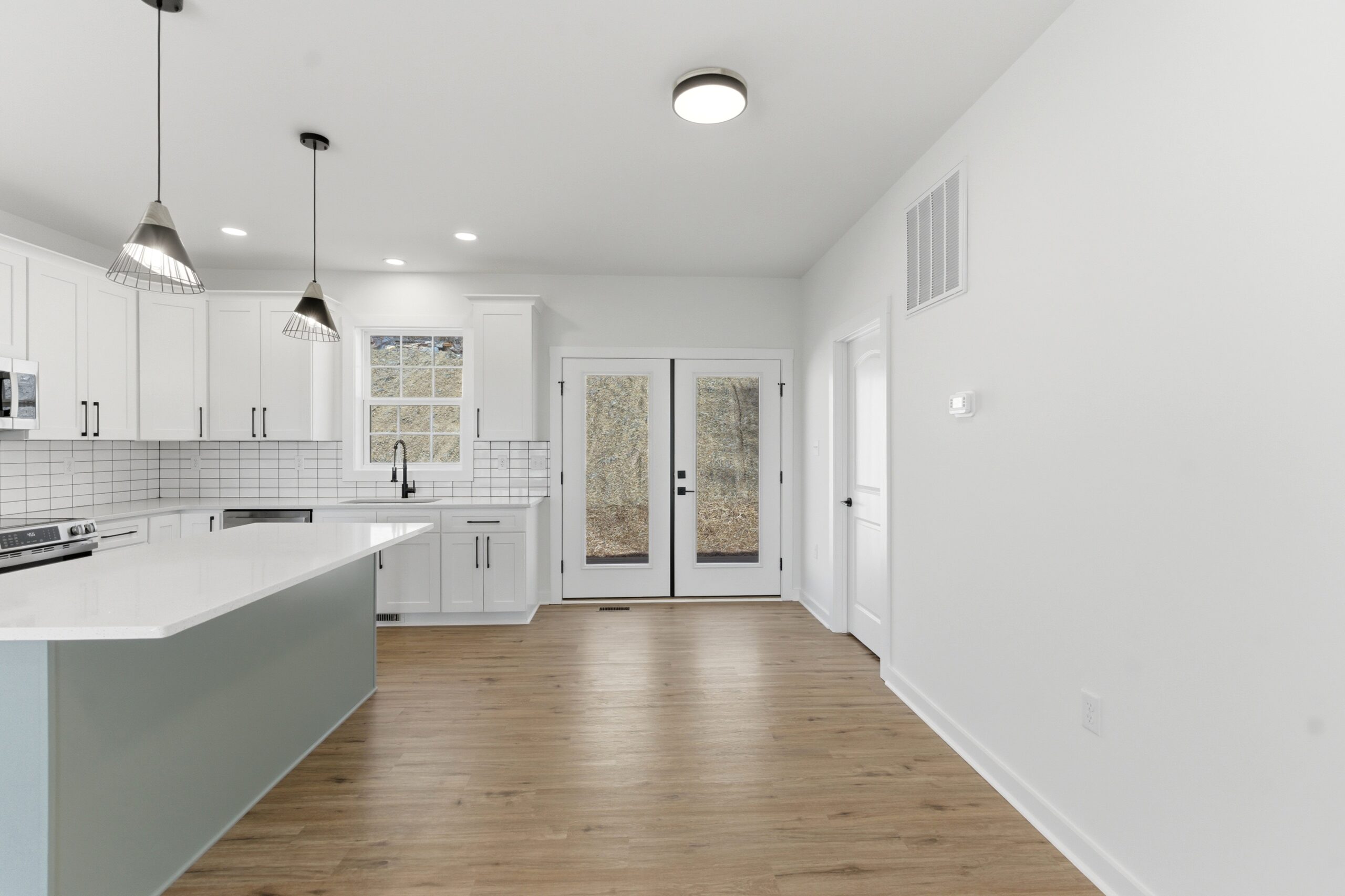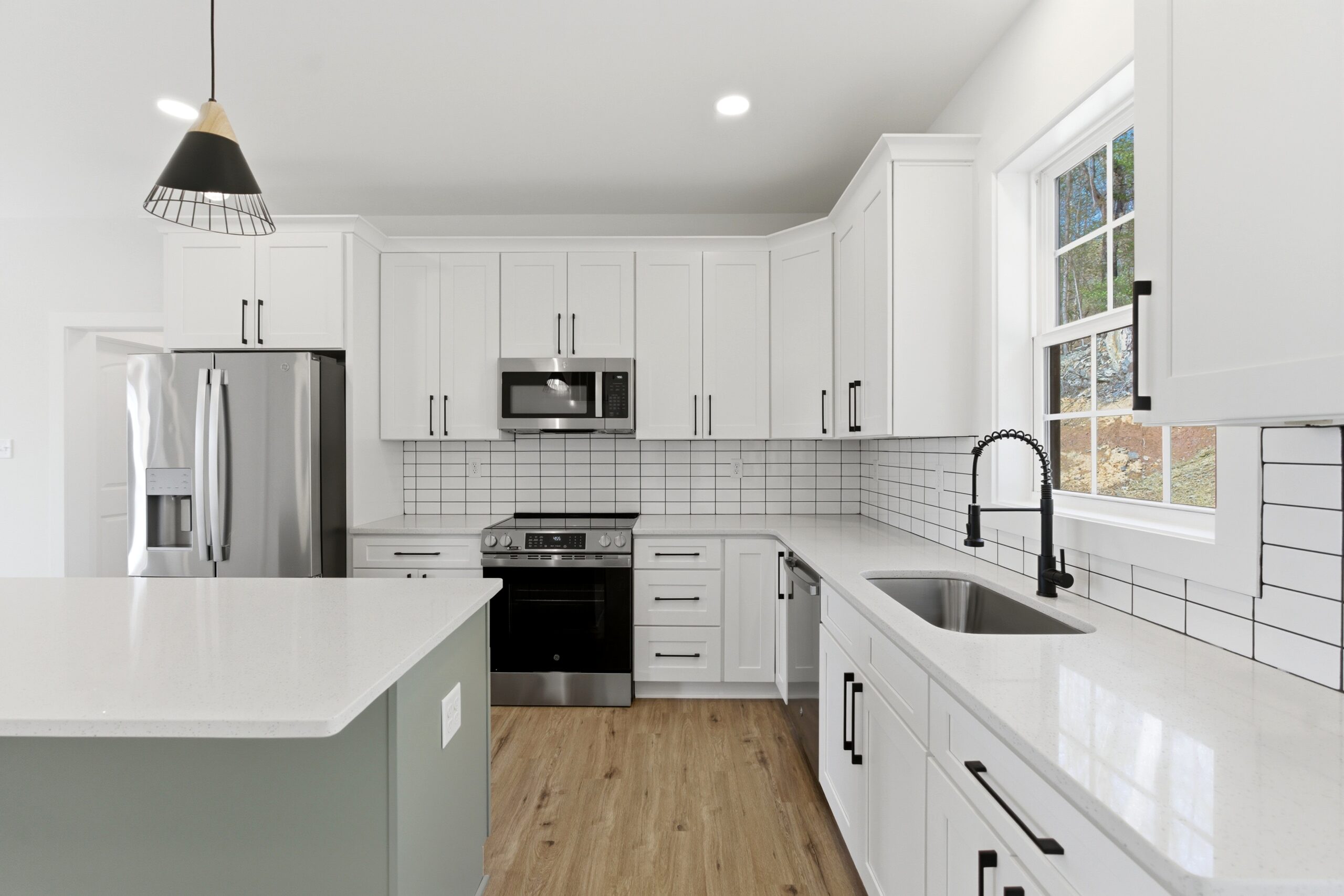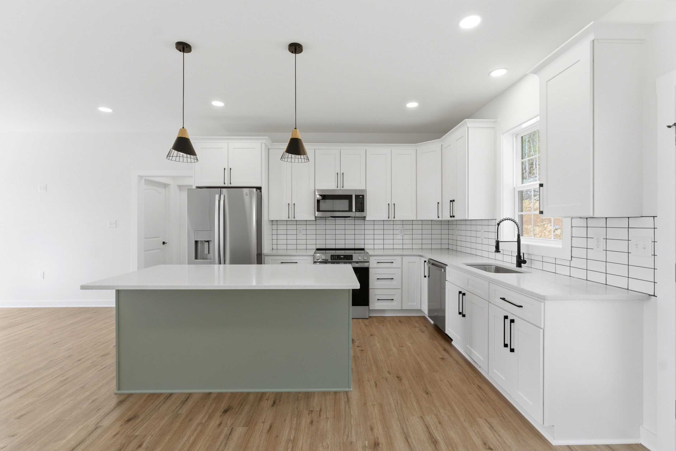 This 3-bedroom, 2-bath country-style home offers 1,334 square feet of well-designed living space, featuring an open-concept layout that seamlessly connects the great room, kitchen, and dining area. The kitchen is equipped with a large island, additional sink, microwave drawer, and ample cabinetry for storage, while an 8-foot-deep deck extends the living space outdoors. A spacious laundry room with built-in cabinets and a nearby exterior door adds convenience, and the split-bedroom design provides privacy, with a comfortable master suite that includes a walk-in closet, double vanities, linen storage, and an oversized shower.