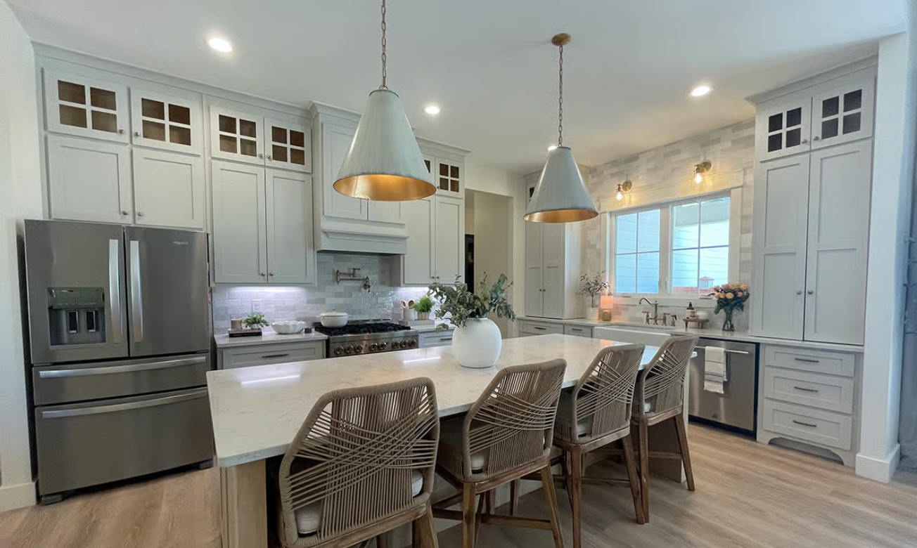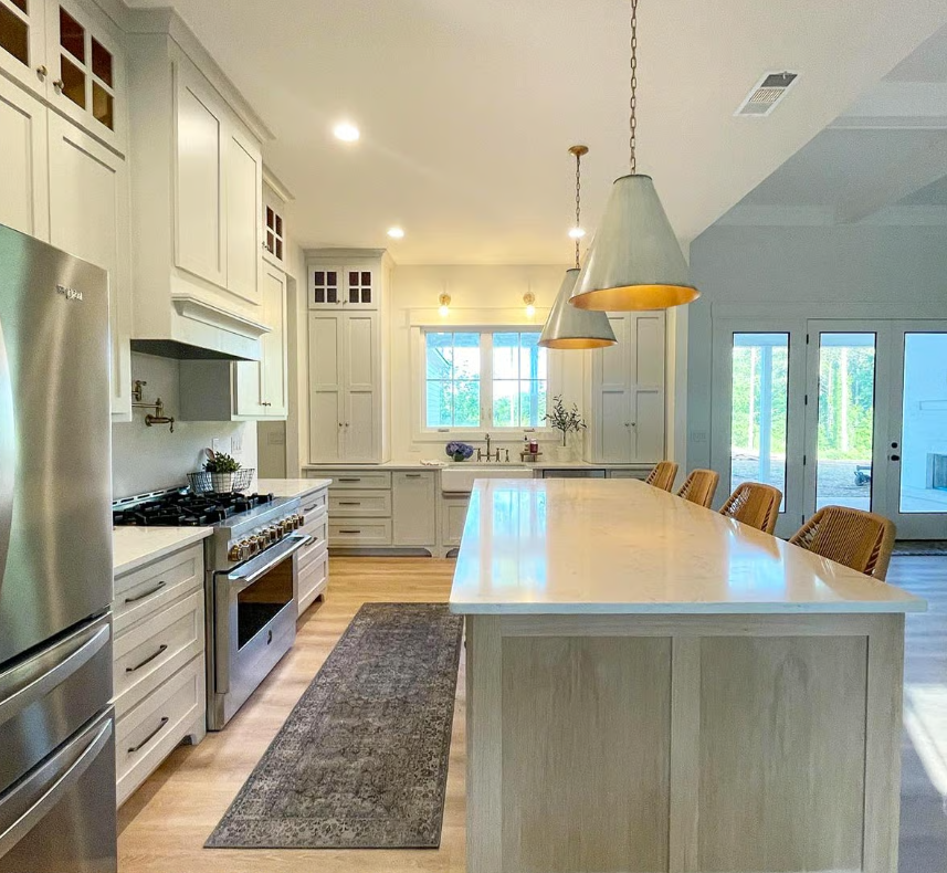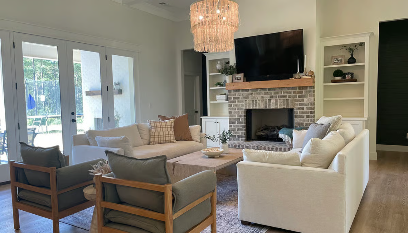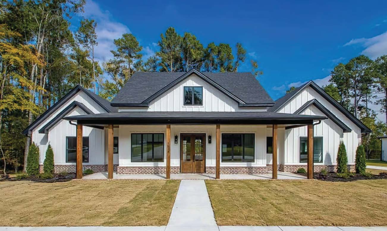 This 4-bedroom modern farmhouse plan offers a balanced and inviting design, highlighted by two front gables and a welcoming porch. Inside, vaulted ceilings in the great room create an open, airy feel, complemented by a fireplace with built-ins and views that extend through the rear porch and into the kitchen. The gourmet kitchen features a large prep island with seating, a walk-in pantry, and easy access to both a formal dining room and an outdoor grilling porch. The private owner’s suite is tucked to one side of the home with vaulted ceilings, a spacious bathroom, and a large walk-in closet, while three additional bedrooms are located on the opposite side, including a Jack and Jill setup and a separate private bath for added comfort and convenience.
